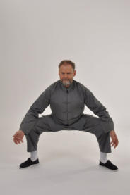 ausatmend aus der Hocke wieder aufrichten.